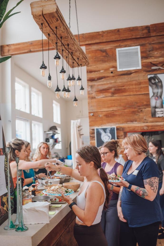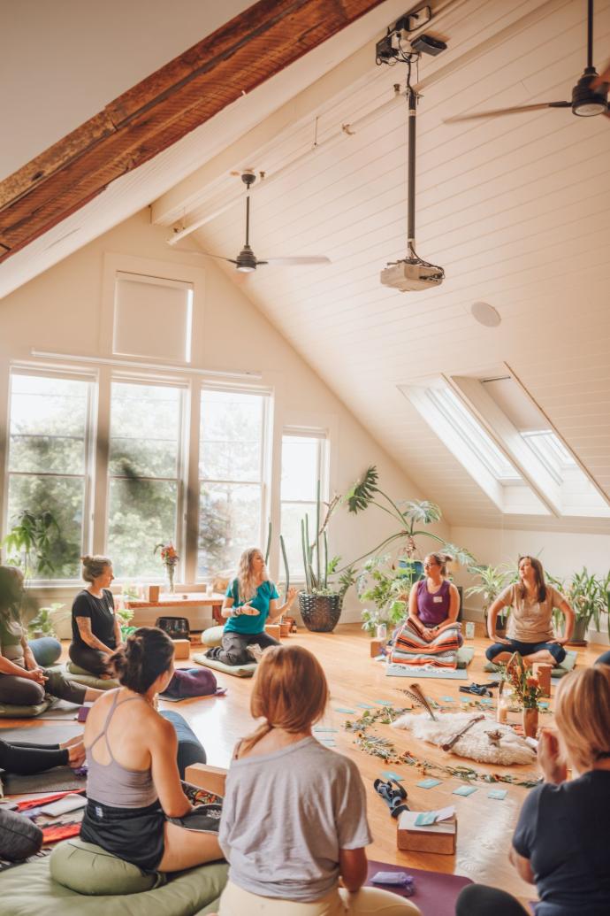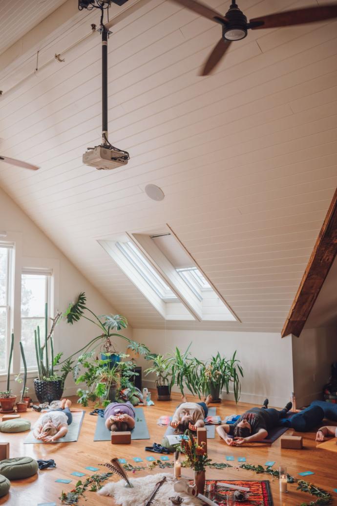 Host your next gathering in a beautiful, flexible space featuring soaring ceilings, exposed wood beams, lush greenery, and a full industrial kitchen. With a yoga studio area, social dining space, and supplies for nearly any setup, this venue accommodates up to 20 guests — perfect for wellness sessions, cocktail hours, book clubs, and more.