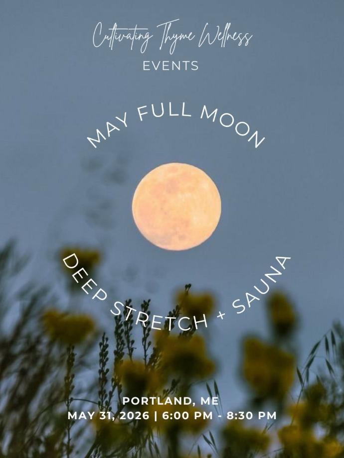 The second full moon of May invites us to slow down and soften. This Deep Stretch + Sauna gathering blends intentional movement with restorative heat to support circulation, relaxation, and release. We will move together, transition into the sauna space, and allow the evening to unfold with ease. A grounded way to honor the season and yourself.